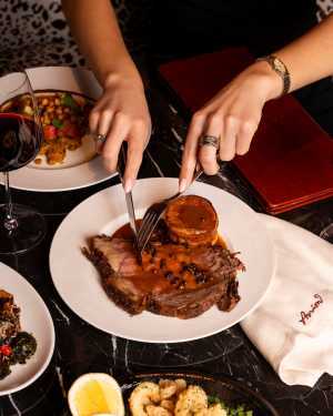 The prime rib is sliced tableside, a detail that plays into the old-school steakhouse energy Ink Entertainment’s Charles Khabouth and Danny Soberano have so carefully cultivated. The steak arrives blushing pink — which might startle diners who favour a more well-done finish — but trust the process. It’s buttery soft, deeply flavourful and expertly seasoned.
