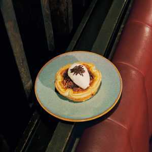 We started experimenting with it, and I got completely obsessed with it. It’s a traditional recipe made with corn syrup, butter, eggs, pecans, chocolate and bourbon. We use puff pastry for the base and top it with Madagascar vanilla bean Chantilly cream.