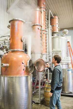 To get around the regulations, Dillon contacted a still builder in Germany to create a hybrid piece of equipment for the distillery — the world’s first, as far as Dillon knew. They put a smaller 450-litre still on top of a 5,000 litre tank. It would allow Dillon to operate at the smaller scale he needed to launch his burgeoning business while also satisfying provincial regulations. “We got our checkmark,” Dillon recalls.