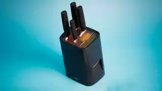 Not only does this Joseph and Joseph knife set look great on any counter top, it has an ingenious lock function to keep little hands away. The knives are held in by a Cam-lock system and can only be removed by an adult size hand so if anyone under the age of five (or the odd case of an adult with extremely tiny hands) tries their luck, the grip only tightens and the knives cannot be forced out.