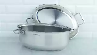 The stainless steel construction (all made in Canada) is durable and safe for use in the oven and stovetop. Its domed lid also doubles as a secondary roasting pan for side dishes and other items. It's also equipped with a removable rack which allows juices to drain away from your bird for more even cooking. We appreciated how the handles of this roaster are angled so that it'll fit into tighter ovens.