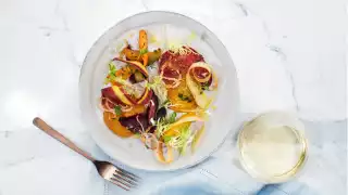 Combine remaining ingredients in a large bowl. Dress liberally with verjus vinaigrette. Top with crisp fried onion rings.