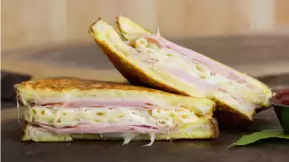 Preheat a non-stick pan on medium and melt a dab of butter. Cook sandwiches as you would French toast, frying on either side until the bread is a rich brown colour. Transfer the sandwiches to a baking sheet and bake for 10 minutes, until cheese is completely melted.