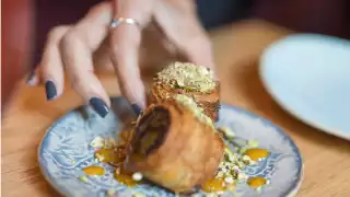 Preheat oven to 350°F. Heat the remaining 2 tablespoons of oil in a frying pan over medium-high heat. Sear the lamb kataifi for 30 seconds on each side, until lightly golden all around. Using tongs, transfer them to a baking sheet and bake for 6 to 8 minutes, until golden brown. Dollop the saffron-aioli on 4 to 6 small plates, add 3 to 4 pieces kataifi on top and garnish with chopped pistachios. Serve.
