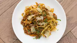 Serve with fresh egg tagliatelle or any other broad long pasta. Garnish with freshly shaved Pecorino.