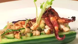 Start by cleaning the squid. First, pull the heads away from the bodies to detach, then set aside. Then remove any connective tissue or other debris from inside the body and set aside. Next, give everything a gentle rinse in cold running water. Check the heads or tentacles and make sure that they've been de-beaked. (If they haven't, simply push the beaks out and discard.) Now you can cut the bodies (tubes) in half lengthwise, and add to a bowl with the heads (tentacles). Add all the marinade ingredients except the salt, and toss to evenly coat. Cover and set aside in the fridge for at least an hour—but no longer than six hours, or else the lemon juice will toughen and chemically cook the squid. In a medium bowl, add the shallot, parsley, cucumber, capers, olive oil, and nigella seeds. Toss to combine and set aside. Discard the marinade and transfer squid to a hot grill or pan; fry them in a very hot, dry skillet for about 1.5 minutes per side—no need to add oil, the squid will hold onto enough from the marinade. Transfer the squid to a cutting board and cut into thin strips. Leave the tentacles whole or cut in half, depending on size. Add the cooked squid to the rest of the salad ingredients, season with the vinegar, salt and pepper, and toss to evenly coat. Taste and adjust for salt if needed. Serve immediately with a glass of bubbly, Chef & Somm style.