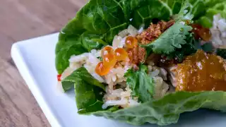 Garnish with cilantro, pea tendrils, salmon roe and chicken skin. Serve on lettuce cups.