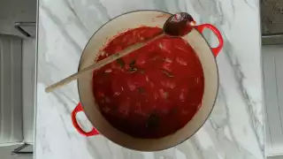 Let simmer gently uncovered for 2 1/2 - 3 hours stirring occasionally. Note: over time, the whole tomatoes should break down on their own (do not try to rush the process, its worth the wait).