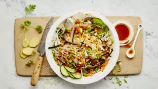 Cook the brown rice. Add the cooked brown rice to the bowl, and layer bean sprouts, cabbage, carrots, cucumber, edamame, scallions, radish and chicken or pork cubes over top. Toss with the sesame ginger dressing, to taste. Garnish with cilantro and nori. Whisk all the ingredients for the Gochujang Mayo together until there are no lumps, and then drizzle it slowly over the bowl.