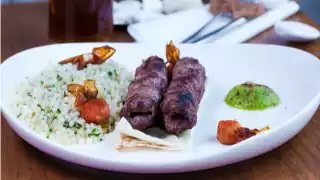 Cook the skewers at a high temperature on the barbecue for approximately 90 seconds each side. The kebabs are finished when they are fully cooked through. Classic sides for serving include saffron rice, charred tomatoes and raw sweet onion, with some mixed herbs sprinkled over top.