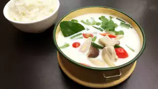 In a medium saucepan, combine the chicken broth, coconut milk, galangal, lemongrass, kaffir lime leaves and bird’s eye chili. Bring to a boil over medium heat. Add the chicken, mushrooms and onions to saucepan and let simmer for 2 minutes or until chicken is cooked tender. Take the pot off the heat. Stir in the lime juice, fish sauce, tomatoes and sugar. Add the sawtooth coriander, cilantro and green onion. Serve with rice.