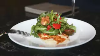 Pan fry the halloumi on both sides over medium heat until golden brown. Place the arugula into a bowl along with the other remaining ingredients and add 2 fl oz of the vinaigrette dressing. Top with the warm halloumi and serve.