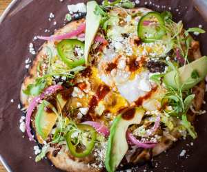 With two kinds of cheese, savoury braised short ribs, and a sprinkling of spicy jalapenos, this breakfast flatbread from Macho Radio Bar also makes a tempting lunch, dinner, or late night snack.