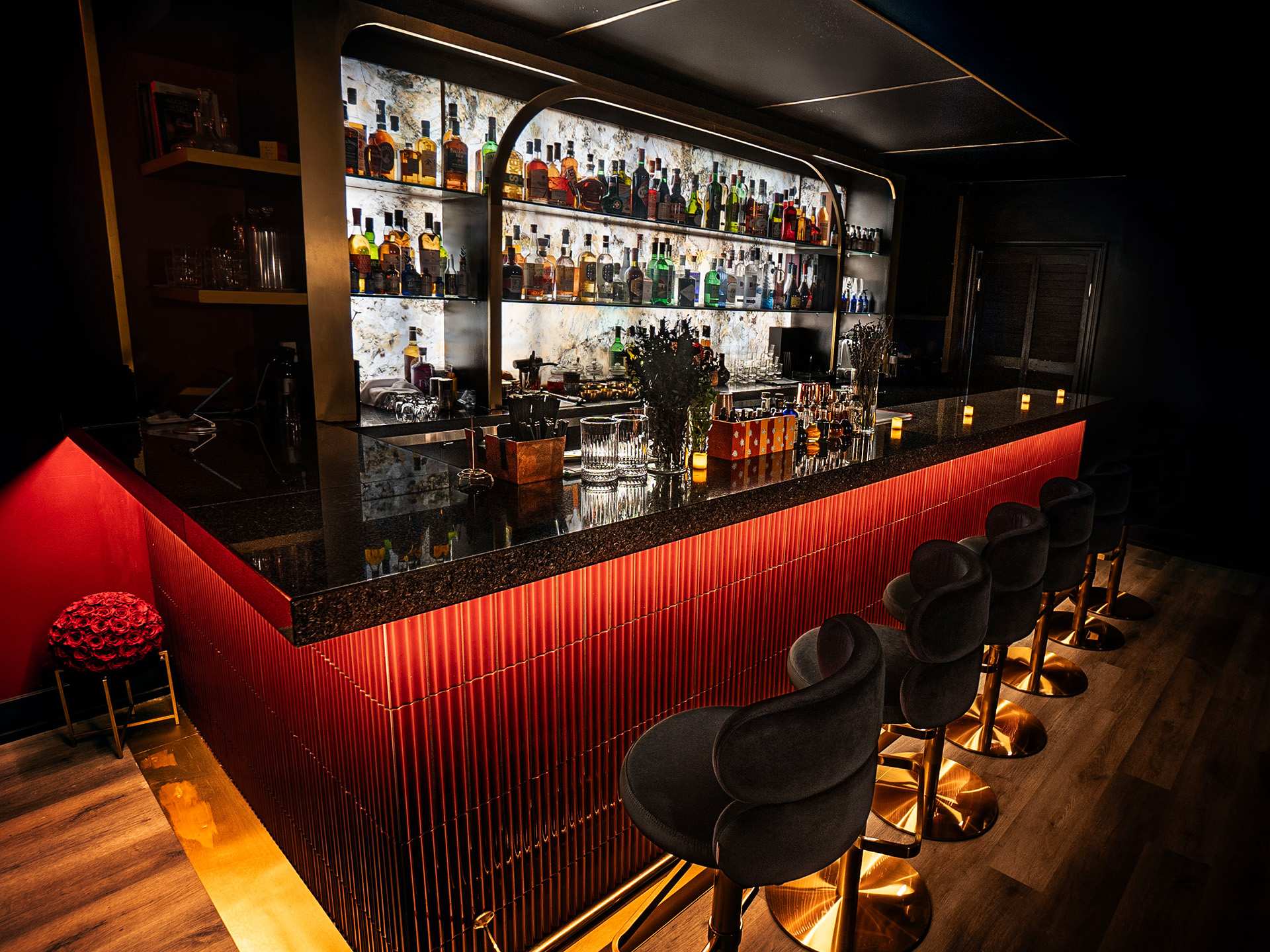 When I arrive at the unmarked door, I’m met with a keypad, so I quickly scan their Instagram stories and uncover the secret code. (It changes daily, so make sure you check before you arrive.) The door swings open, revealing a steep, carpeted staircase leading up to the speakeasy. Inside, a tall, dark and handsome bar greets me, glowing under soft mood lighting and accented with polished gold. Plush armchairs line the red walls, and everything is bathed in a low, mysterious light — a foolproof ambiance for sipping excellent tipples.