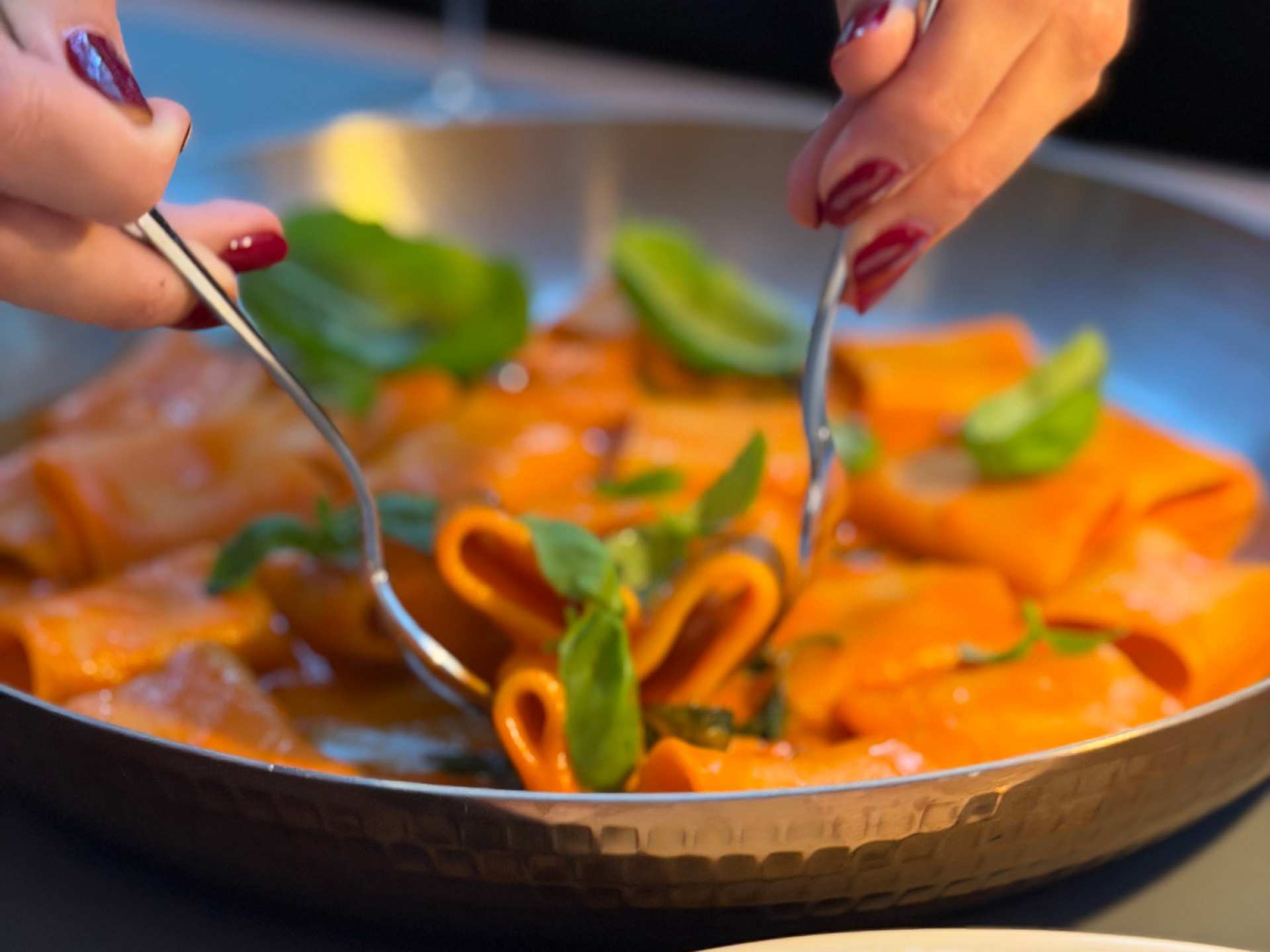 I fell hard for the Paccheri alla Vittorio served in a shining copper pot. The oversized rigatoni-like tubes arrive swimming in a glossy tomato-butter sauce, the colour of sun-baked terracotta. The Porchetta Experience is yet another immersive element at Oretta Downtown, where chefs carve the herb-infused pork and its perfectly crispy skin right in front of guests.